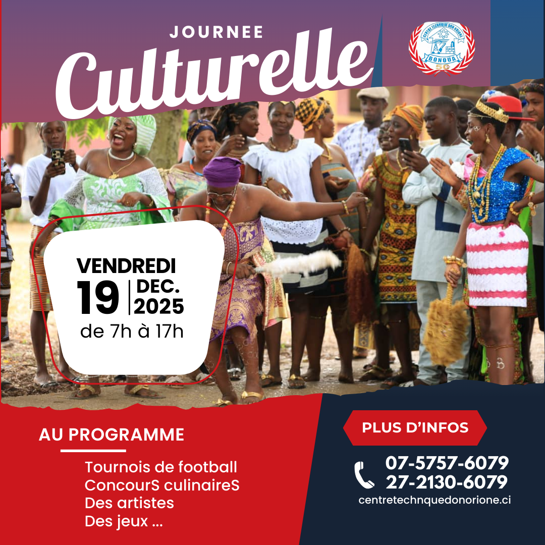 Le Centre Technique Don Orione a l’honneur d’annoncer l’organisation de sa Journée Culturelle, une activité ouverte à tous et placée sous le signe du partage, de la culture et de la convivialité. 📅 Date : Demain ⏰ Heure : de 07h00 à 17h00 🎽 Code vestimentaire : Tenue Année 50 obligatoire 🗓️ Au programme ⚽ Tournois de football 🍲 Concours culinaires 🎤 Prestations d’artistes 🎲 Jeux et animations diverses Cette journée vise à valoriser les talents, renforcer la cohésion et promouvoir la richesse culturelle au sein et autour de notre établissement. 📍 Lieu : Centre Technique Don Orione 📞 Contacts : 07 57 57 60 79 27 21 30 09 64 🌐 Site web : www.centretechniquedonorione.ci 👉 Élèves, parents, anciens élèves, partenaires et grand public : vous êtes cordialement invités. Venez nombreux célébrer la culture avec nous.