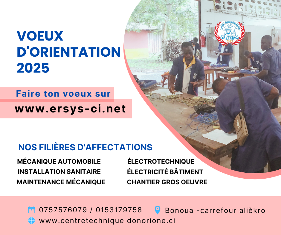 🎓 BEPC ou pas, ton avenir t'attend ! 🔧⚡🔩 Tu n’as pas eu le BEPC ? Ou tu l’as eu et tu veux aller plus loin autrement ? 👉 Le Centre Technique de Bonoua t’ouvre ses portes pour une formation professionnelle de qualité dans des métiers concrets et recherchés : électricité, mécanique, froid, plomberie et bien plus encore ! 🔥 ✅ Formations pratiques ✅ Diplômes reconnus (CAP, BT) ✅ Insertion rapide dans le monde du travail ✅ Encadrement de qualité Nos filières de formations ELECTROTECHNIQUE ELECTRICITE BATIMENT INSTALLATION SANITAIRE MECANIQUE AUTOMOBILE MAINTENANCE MECANIQUE CHANTIER GROS OEUVRE 🎯 Quel que soit ton résultat au BEPC, tu peux réussir ! Alors, qu’est-ce que tu attends ? 📞 Contacte-nous vite au 0757576079 📍 Centre Technique Don Orione de Bonoua Construis ton avenir avec nous dès aujourd’hui ! 💪 #FormationProfessionnelle #BEPC2024 #CentreTechniqueBonoua #AvenirAssuré #MétiersManuels #Orientation